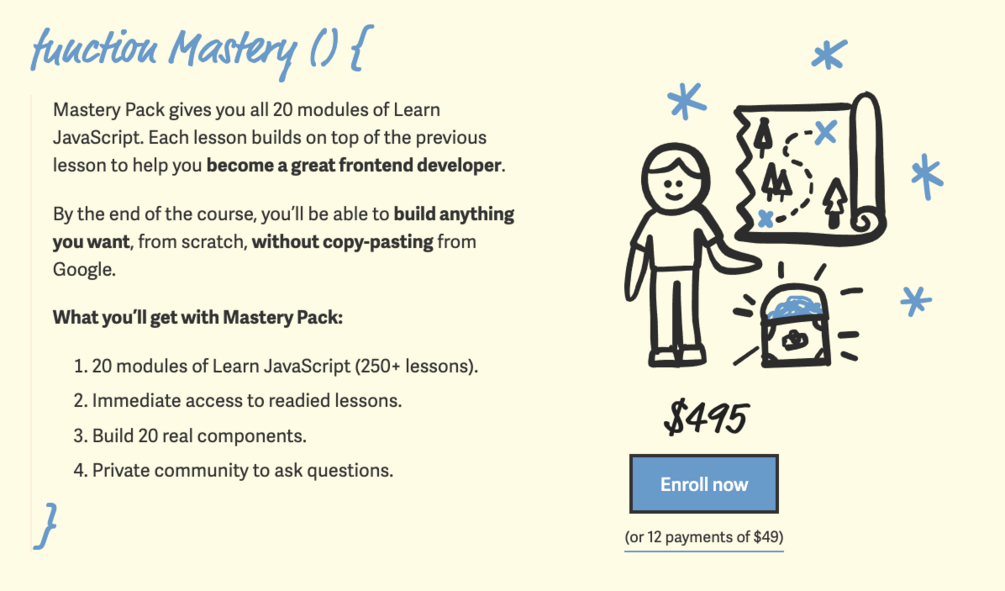 Mastery Pack gives you all 20 modules of Learn JavaScript. Each lesson builds on top of the previous lesson to help you become a great frontend developer.